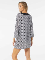The Beach House Swim Faye Caftan Cover Up features an abstract black and white print on an easy fit silhouette with long sleeves and tie front neck.