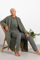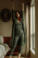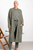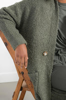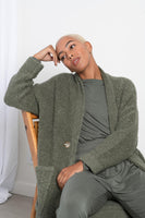 The Madeline home coat in ash green is a warm and cozy cardigan for cool fall days. The fabric blend includes alpaca and sheep's wool, making it super fluffy and warm. A single button keeps it closed and convenient side pockets hold your essentials.