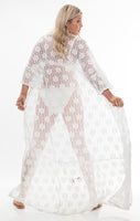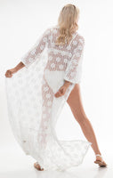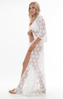 The Tulum lace maxi kimono is a gorgeous full-length white beach cover up that can double as a top. The lightweight floral pattern lace design looks perfect at the beach or with a pair of jeans.