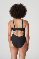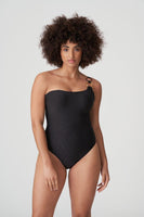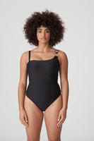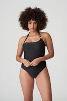 A classic black one piece swimsuit with a stylish shimmering gold lurex pinstripe. The asymmetric one shoulder neckline is suitably supportive for a fuller bust. Perfect for the poolside! The eye-catching gold rings on the right shoulder draw the eye and the straps can be worn classically over both shoulders, one shouldered or halter style for fantastic versatility.