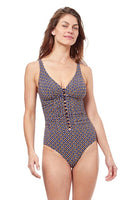 A plunge style, V neckline, one piece from Profile by Gottex. In a geometric print with beaded detail down the centre, this suit is sure to be a go to for comfort. With a built-in shelf bra for support, light tummy control, and adjustable straps.