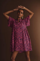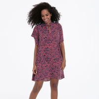A beautiful mid thigh length tunic style coverup with Rosewood spots based on a navy blue background, a frilled neckline that has ties to wear loose or cinch for a different look.