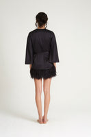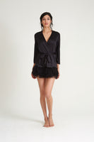 This feather trimmed satin robe from the Rya Collection embodies class and elegance. A classic style that goes with everything. Pair with a simple chemise to let the robe take center stage. Available in black, ivory, and sangria.