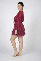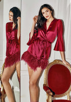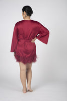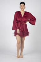 This feather trimmed satin robe from the Rya Collection embodies class and elegance. A classic style that goes with everything. Pair with a simple chemise to let the robe take center stage. Available in black, ivory, and sangria.