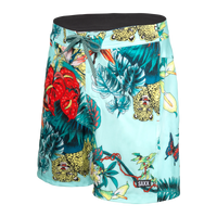Saxx Betawaves are the first-ever board short equipped with the BallPark Pouch™ for amazing support. The slim Fit liner under a fixed-waist shell reduces chafing and keeps him contained during summer activities. Other features include a rear patch pocket with security key loop, front pockets, and stash pocket on the leg. This style has a 7 inch inseam. Blue Disco Jungle is such a fun print!