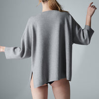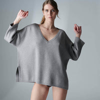 Lazy Sunday mornings in bed are made all the more cozy with this ultra-soft thick knit 2 piece lounge set from Simone Perele in a delightful Breezy Grey shade. The top is an oversized fit with a plunging V neckline with straight leg trousers that taper towards the ankle. Amazingly soft, and constructed from an ultra-fine knit, this is your new cozy companion. Designed for chic comfort with wide waistbands, wide cuts and silhouettes that compliment your curves.
