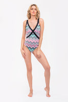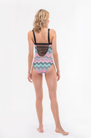 This eye catching one piece swimsuit from Sunseeker in Pink Lemonade is sure to turn heads. A flattering V neckline with bold black stripes offset by the chevron print makes this a fantastic suit to own.