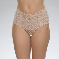 The Hanky Panky retro is a high-waisted panty with figure-flattering coverage that stretches to beautifully fit sizes 0-12. With no visible panty line and an extra-generous band of lace that hugs your midsection