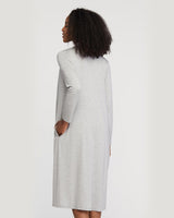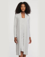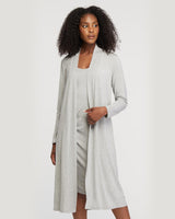 This lovely soft robe from Fleur’t in Heather Grey has pockets and can be worn anytime. This style does not have a tie or drawstring.