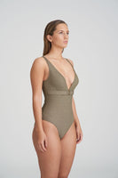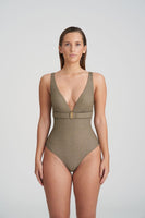 A plunge neckline on the front and a deep rounded V neckline on the back with eye-catching metallic thread details and a cute belt design, this wireless suit will be a new favourite! The straps on this suit are not adjustable.